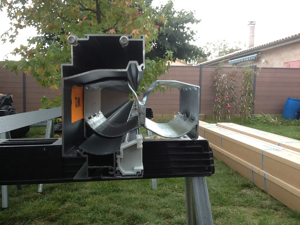 Pour y parvenir, les techniciens EXTEND ont imaginé une pièce de liaison spécifique, permettant de coupler les deux pergolas et de supprimer plusieurs poteaux.